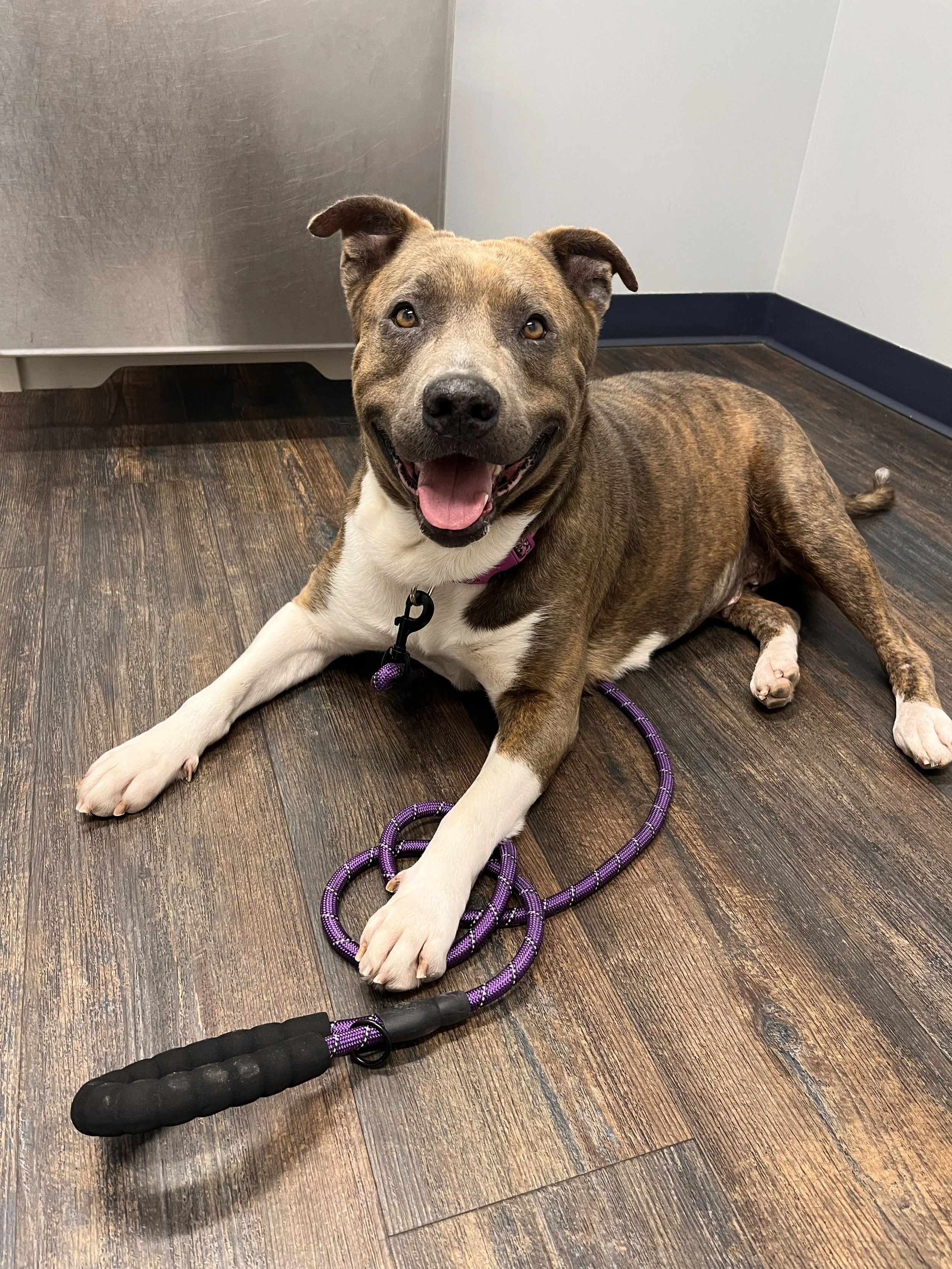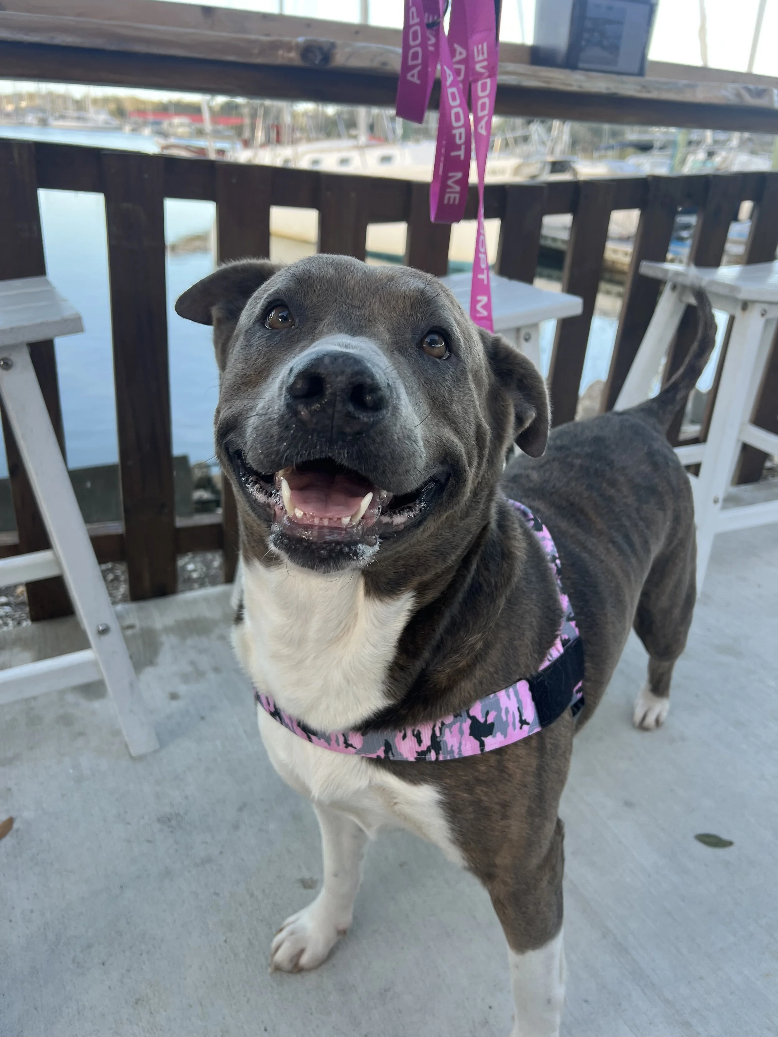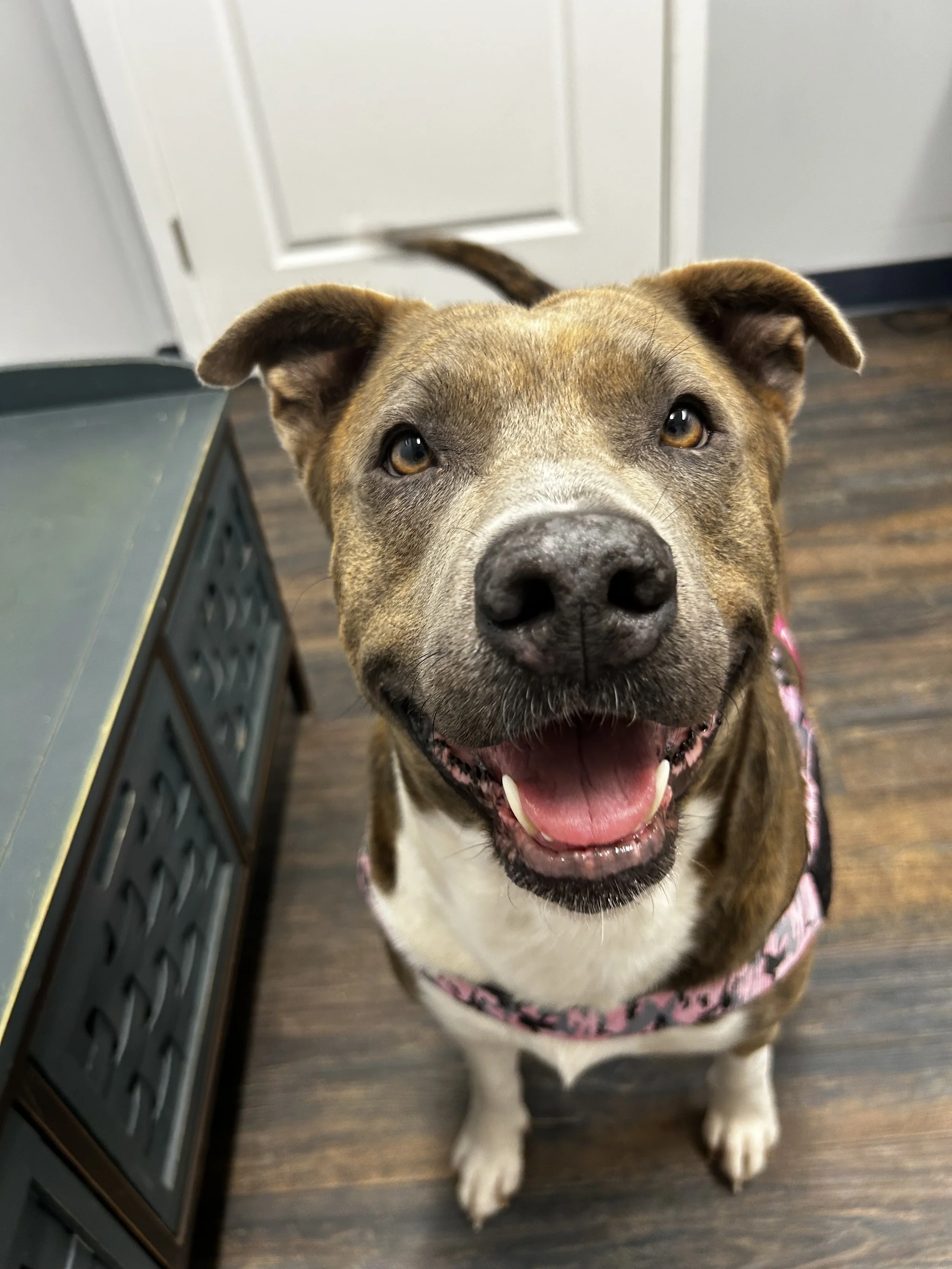 Queenie’s boisterous demeanor and nonstop butt wiggles drew us in immediately. Queenie was found as a stray with another dog. Turns out she had found a friend out and about, as her dog friend had an owner that reclaimed her, and had no idea who Queenie was! This says a lot about Queenie and her infectious personality. It is obvious Queenie has had quite a few litters in her time, and we are so happy that now life gets to be all about her! Queenie is two years old and 70lbs. She has been dog friendly, playful, and is looking for a foster home currently.