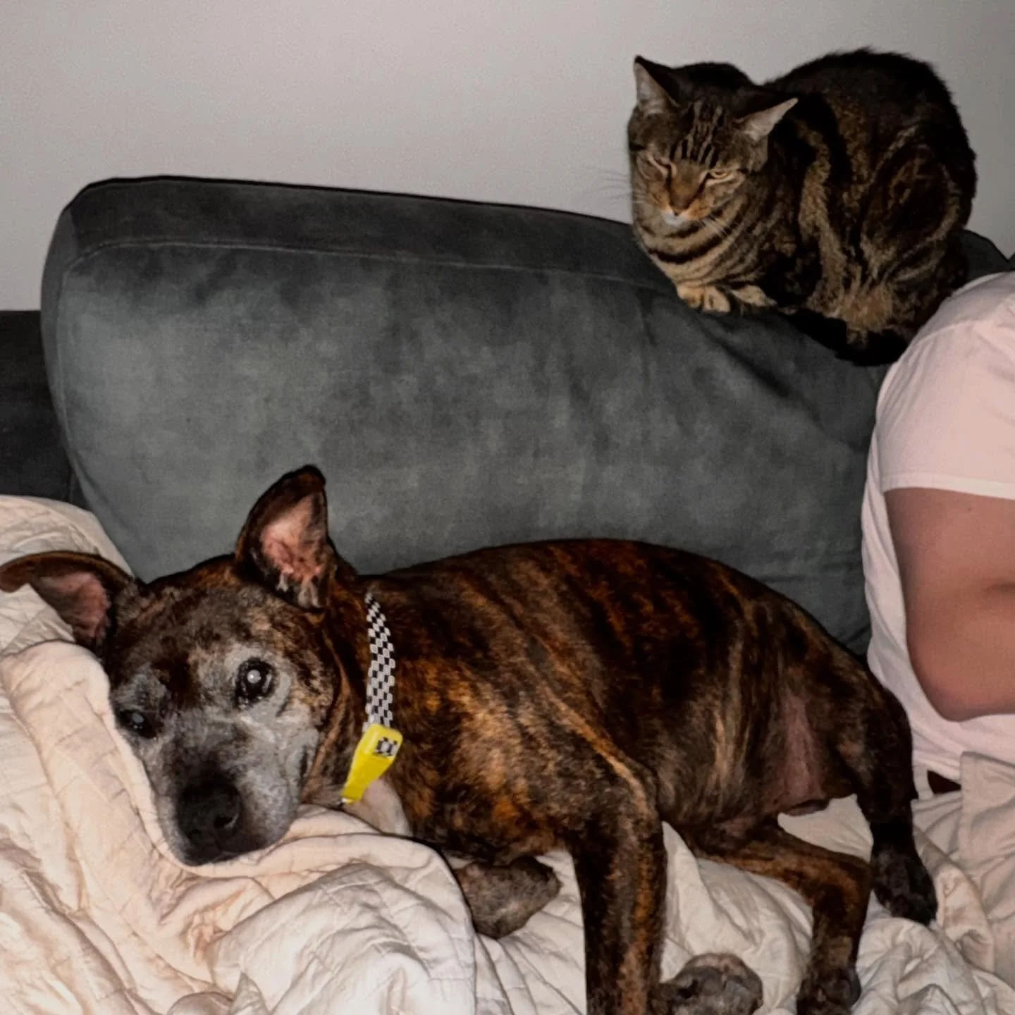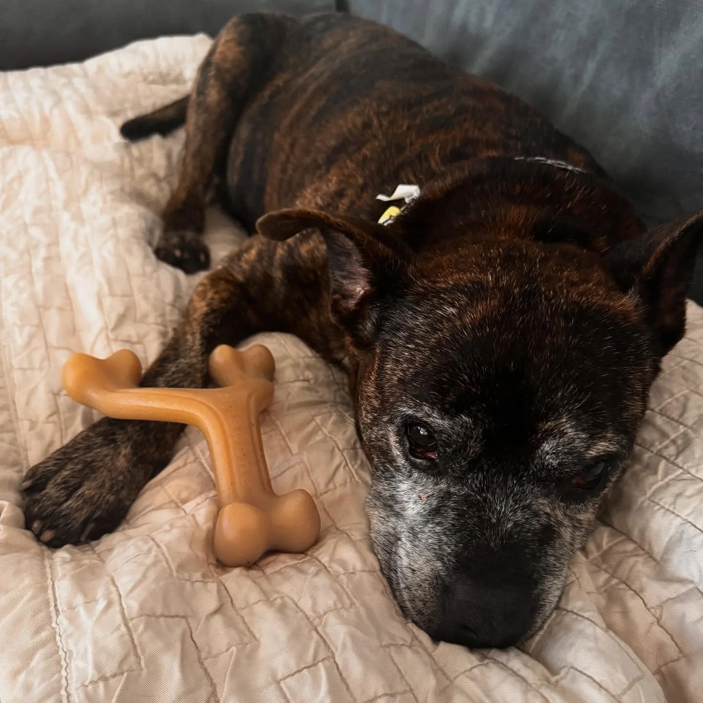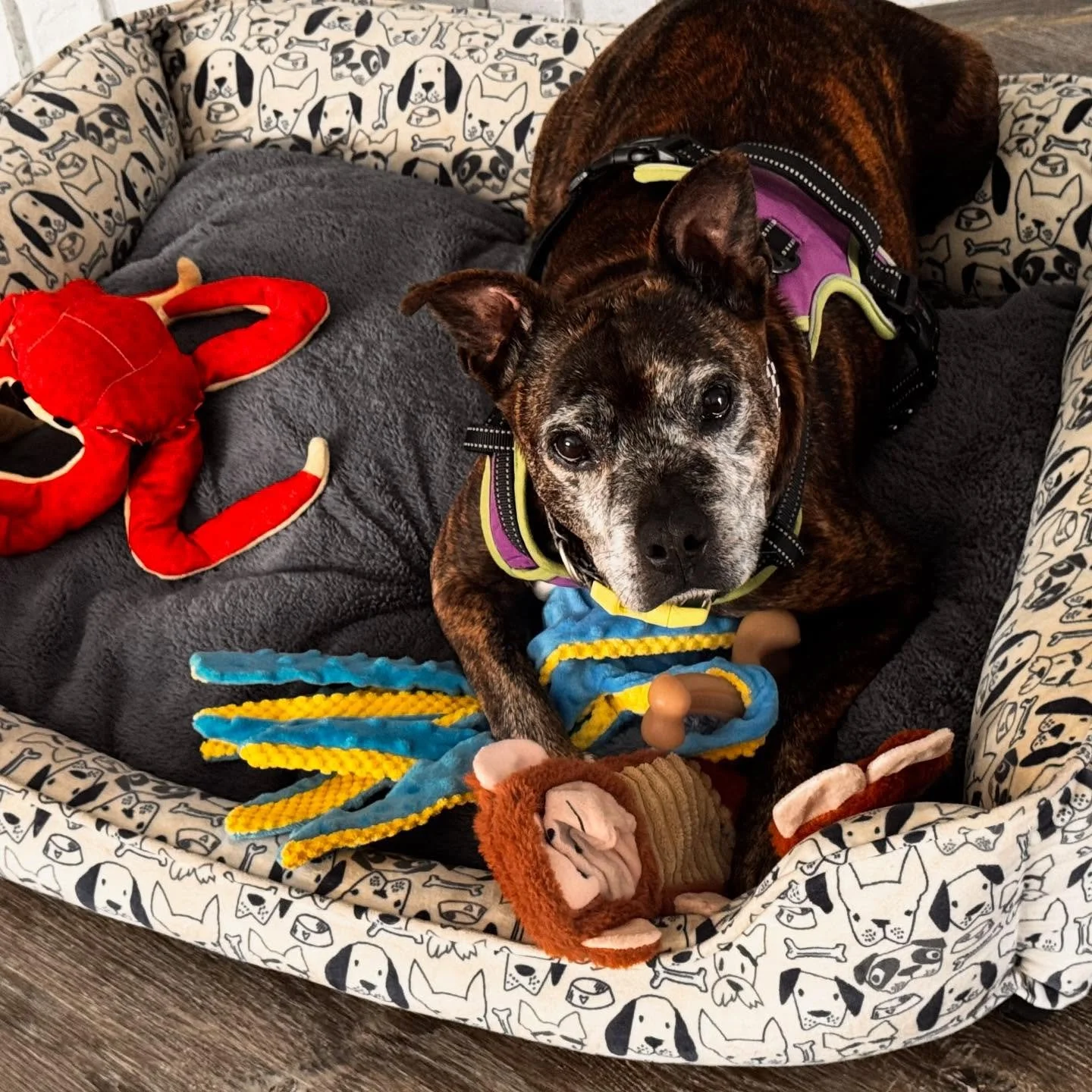 It didn’t take us long to realize why this adorable frosted fellow was a staff favorite! He’s the perfect mixture of playful couch potato and snuggly adventurer. Fast forward a few months and his foster mom seemed to agree because she sent us a “I just love him and would really like to adopt him” text and the rest was history!